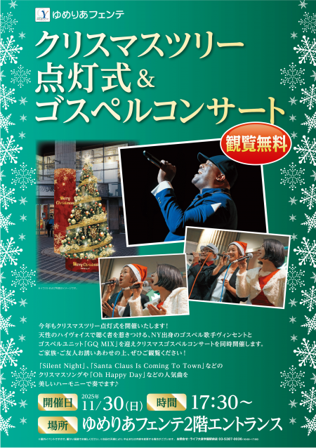 11月30日(日)は毎年恒例の「クリスマス点灯式&ゴスペルコンサート」を実施します! ご家族ご友人お誘いあわせの上、是非ご観覧ください!